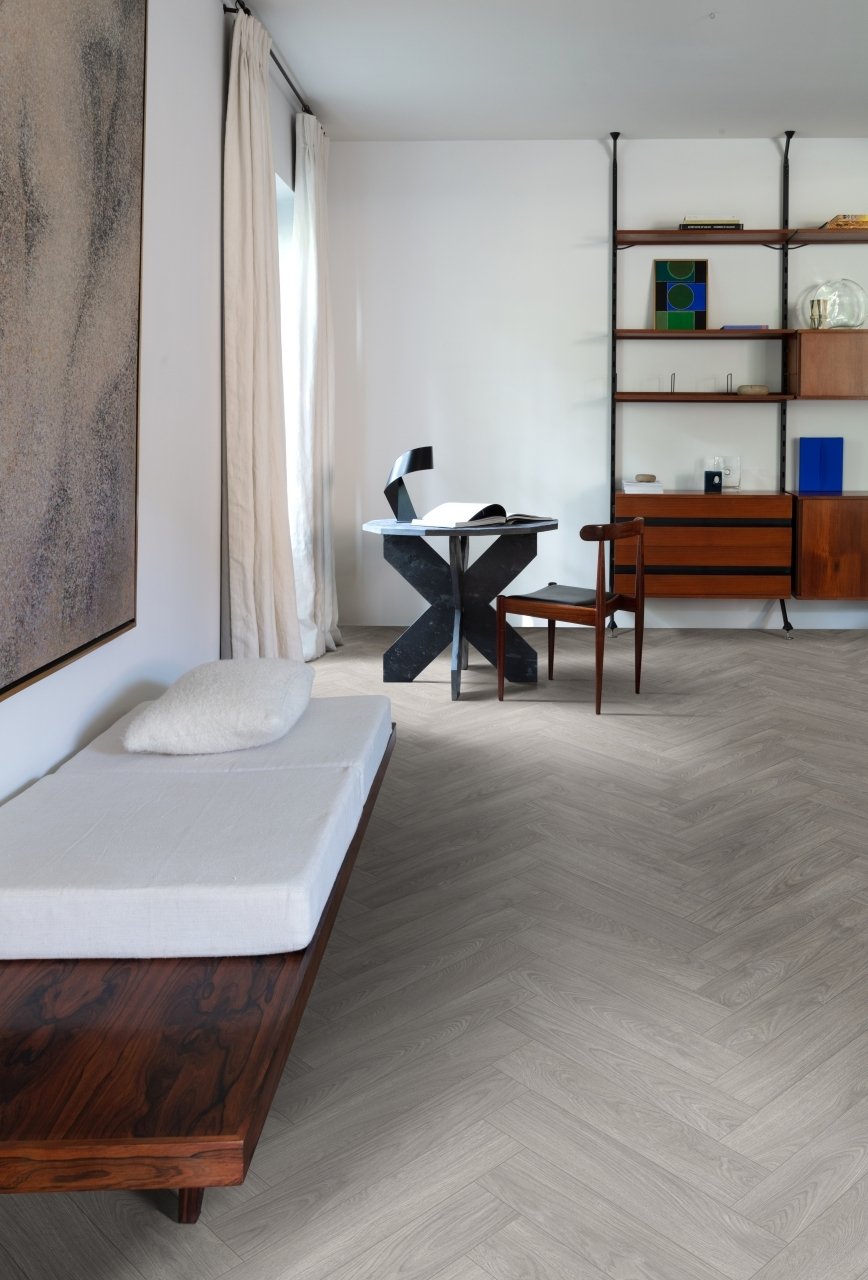 Виниловый ламинат Moduleo LayRed Herringbone Laurel Oak 51914 с тиснением в регистр от бренда Moduleo - это идеальное решение для тех, кто ценит высокое качество и стильный дизайн в своем доме. Этот виниловый пол не только привлекает внимание своим элегантным серым декором под дерево, но и обладает множеством преимуществ, которые делают его незаменимым для любого интерьера.